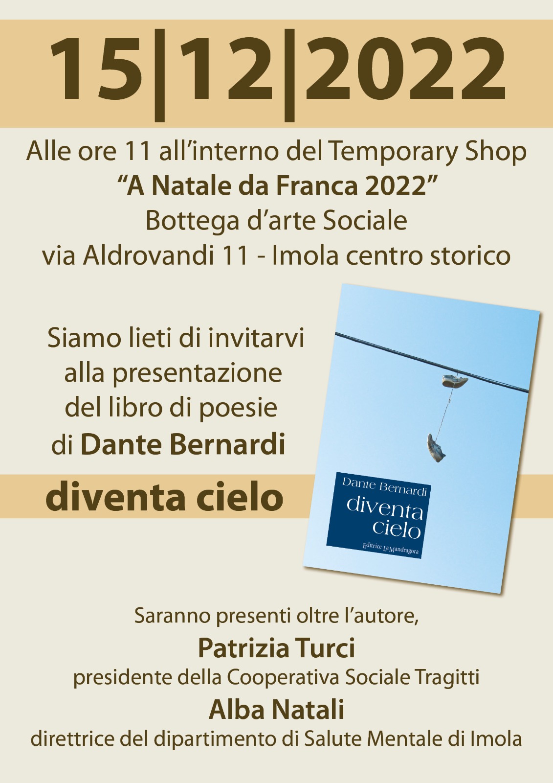 Saranno presenti oltre l'autore, Patrizia Turci presidente della Cooperativa Sociale Tragitti Alba Natali direttrice del dipartimento di Salute Mentale di Imola