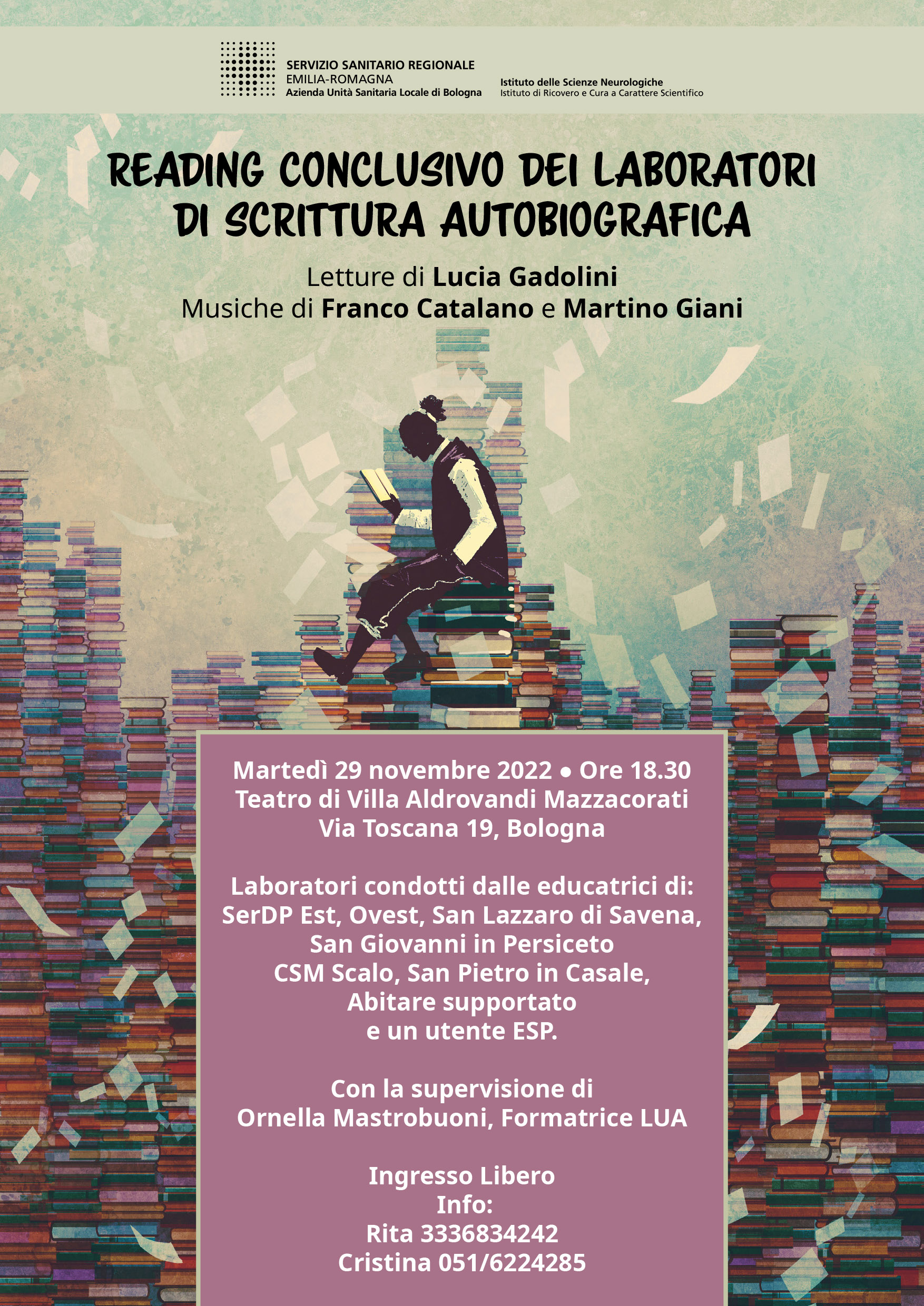 Il reading è tratto dai laboratori condotti lo scorso inverno a Bologna dalle educatrici di SerDP Est, Ovest, San Lazzaro di Savena, San Giovanni in Persiceto, CSM Scalo, San Pietro in Casale, Abitare supportato e un utente ESP. Con la supervisione di Ornella Mastrobuoni, formatrice LUA
