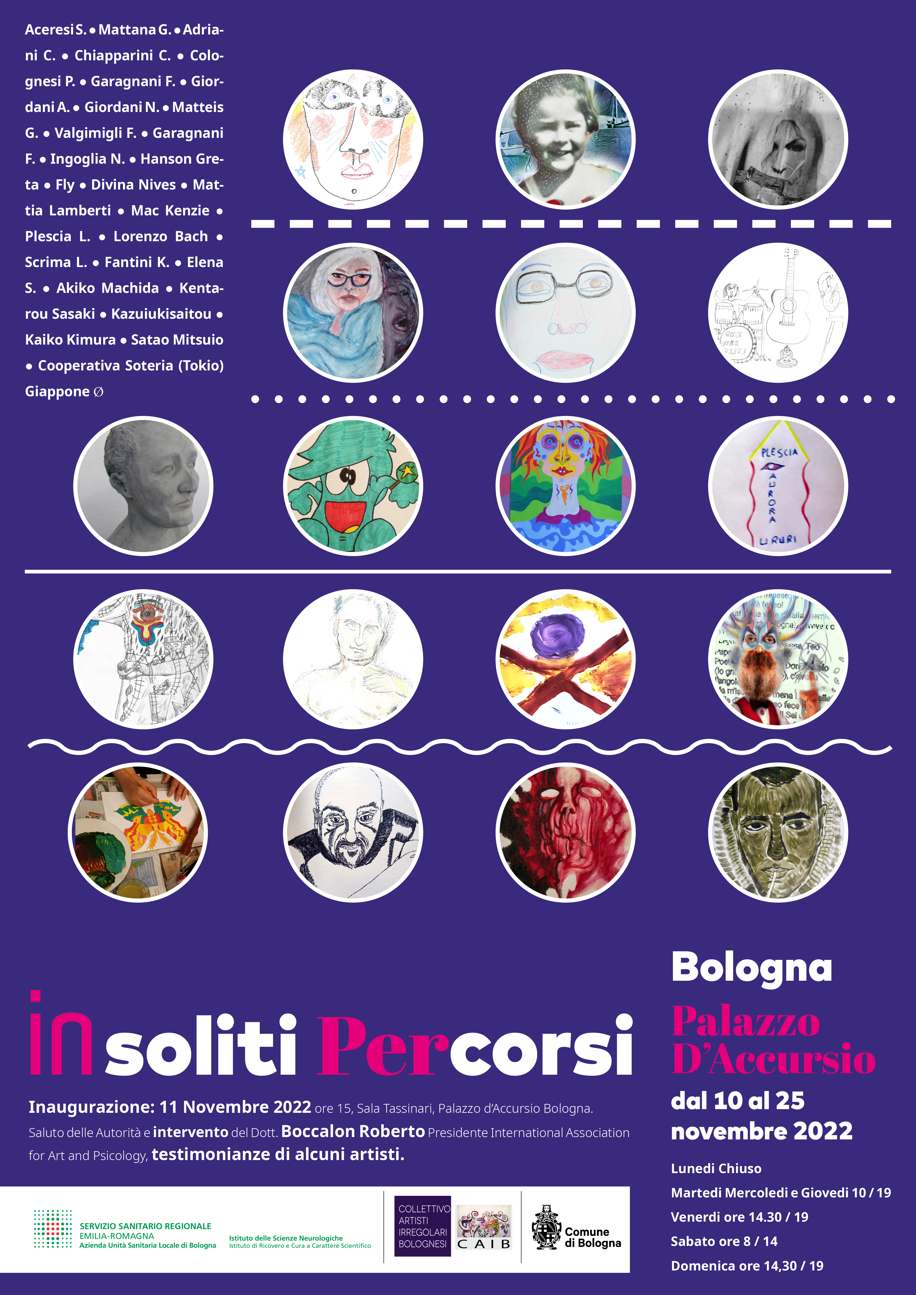 "Insoliti Percorsi", le opere del Collettivo Artisti Irregolari Bolognesi e i lavori di sei artisti della coop Soteria di Tokio (Giappone) in esposizione fino al 25 novembre a Palazzo D'Accursio, Bologna.